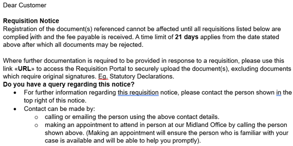 If a document/case requires correction or additional evidence, the document lodging party will be issued with a requisition notice under s192 of the Transfer of Land Act 1893 (TLA). The email delivering the requisition notice and/or the requisition notice contains a web address to access the Requisition Portal. Together with a MyLandgate login, access to the specific requisitioned case will be granted.